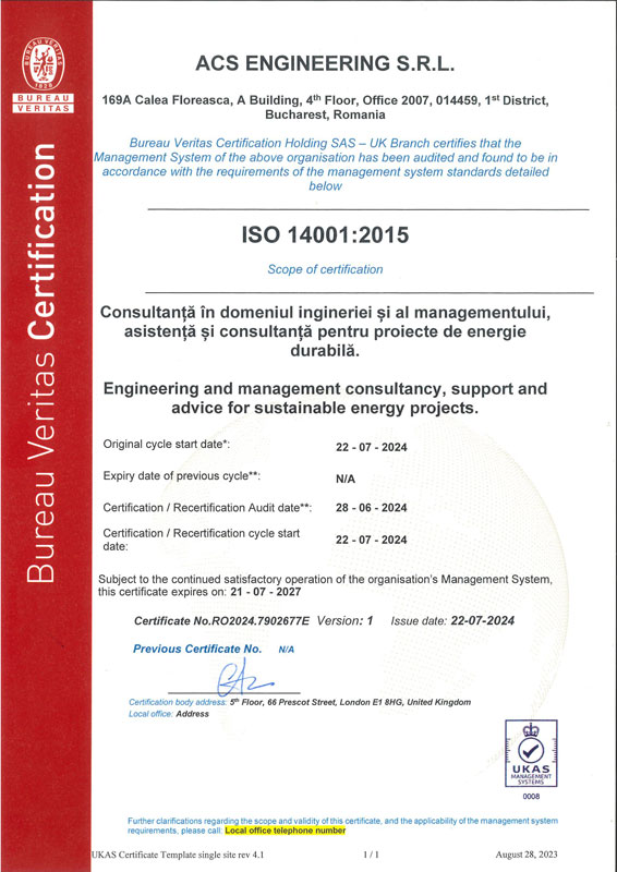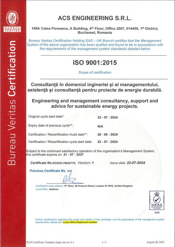 ACS Engineering is proud to be certified in ISO 9001, 14001, and 45001, reflecting our commitment to quality, environmental sustainability, and occupational health and safety. These certifications align with our mission as an independent renewable energy advisor, enabling us to provide expert guidance and support for developing and operating energy projects efficiently, sustainably, and safely.